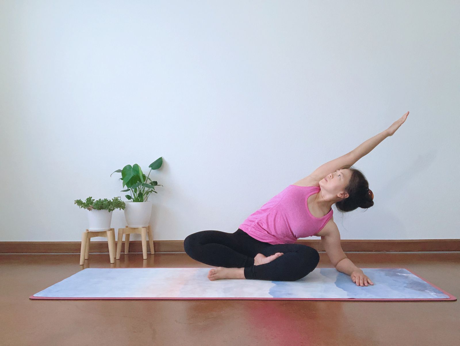 While sitting in the easy pose, inhale and extend both arms straight out to your sides (palms down) to form a ‘T’ with your torso. Exhale and place your left hand on the floor with your elbow slightly bent, reaching your right arm up over your head (turning your right hand as you lift your arm so your palm leads the way) and leaning to your left side. Hold the pose for a comfortable length of time, breathing naturally.