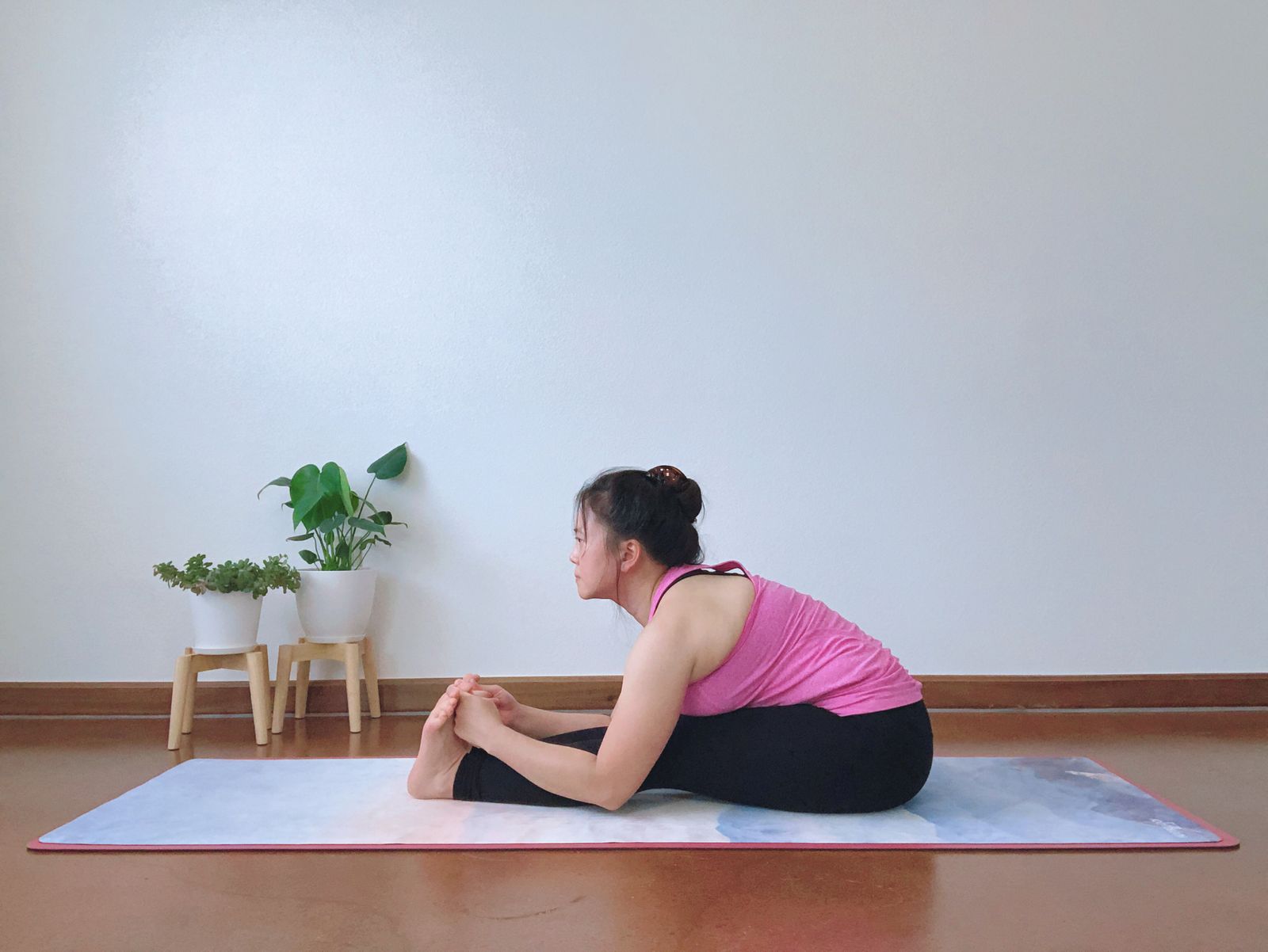 Sit on the floor with your legs straight in front. Gently swing your knees outward with your feet touching, then shift your feet so that your right heel is resting in front of your left shin.