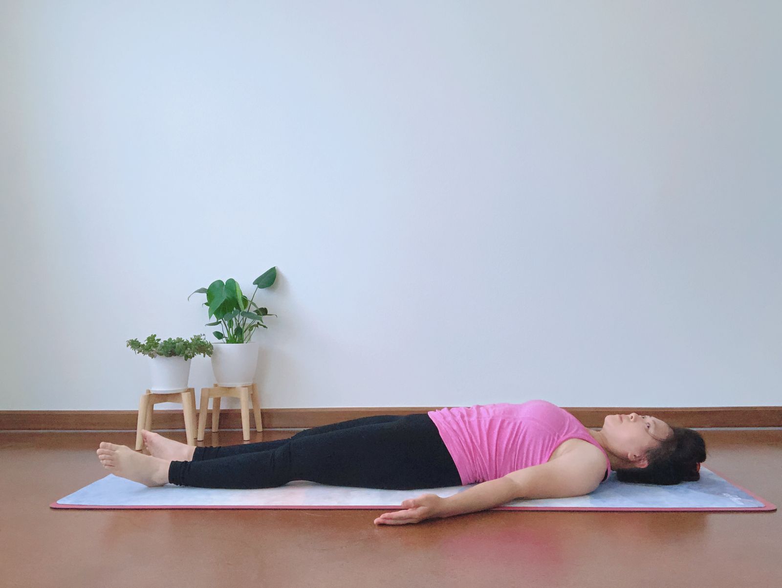 Shavasana is a restorative posture that provides deep rest and relaxation for the body and mind. Lie flat on your back with your arms relaxed to your sides, palms facing upwards, feet slightly apart, and close your eyes. A thin pillow or folded towel may be placed behind your head to prevent discomfort. Take a few deep breaths as you become aware of the natural breathing, and allow your body to relax and your mind to fall into stillness.
